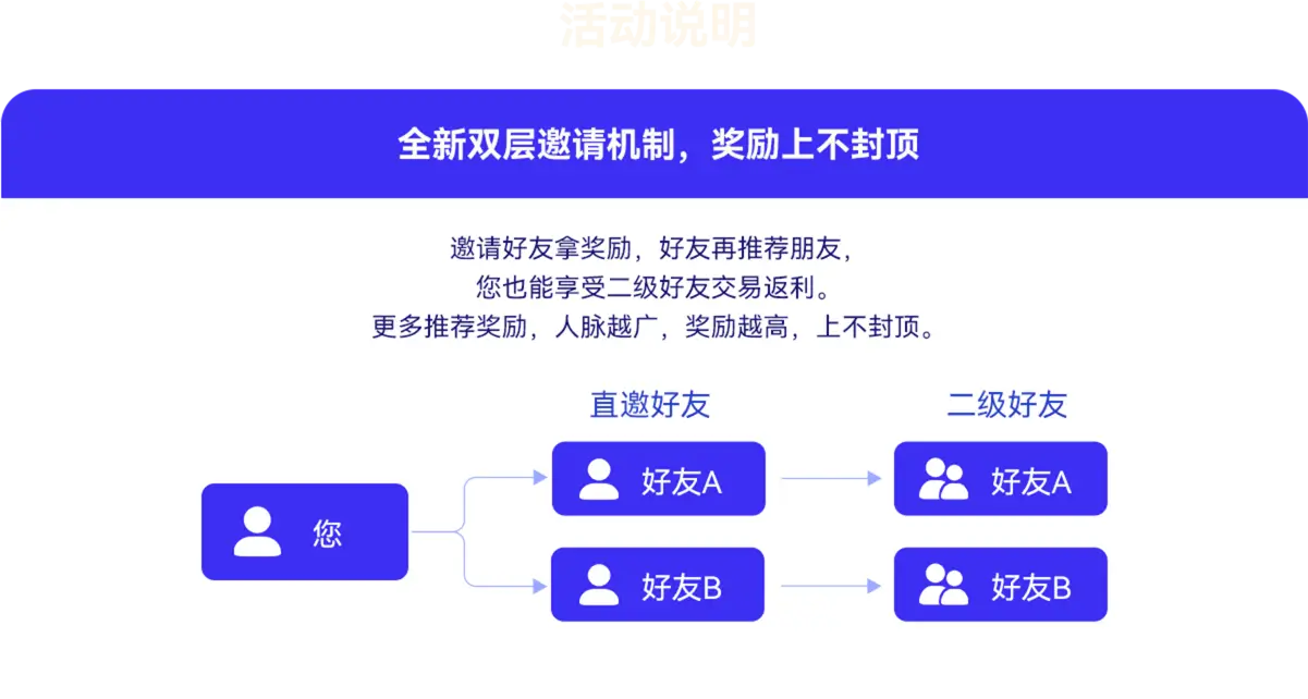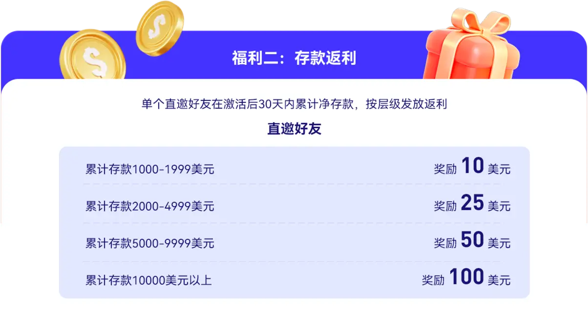 (3)存款奖励统计的是直接单个邀请好友在激活后30天内的累计存款,当存款达到对应层级,即可领取对应的存款奖励。按每周发放时最新存款金额数据发放。