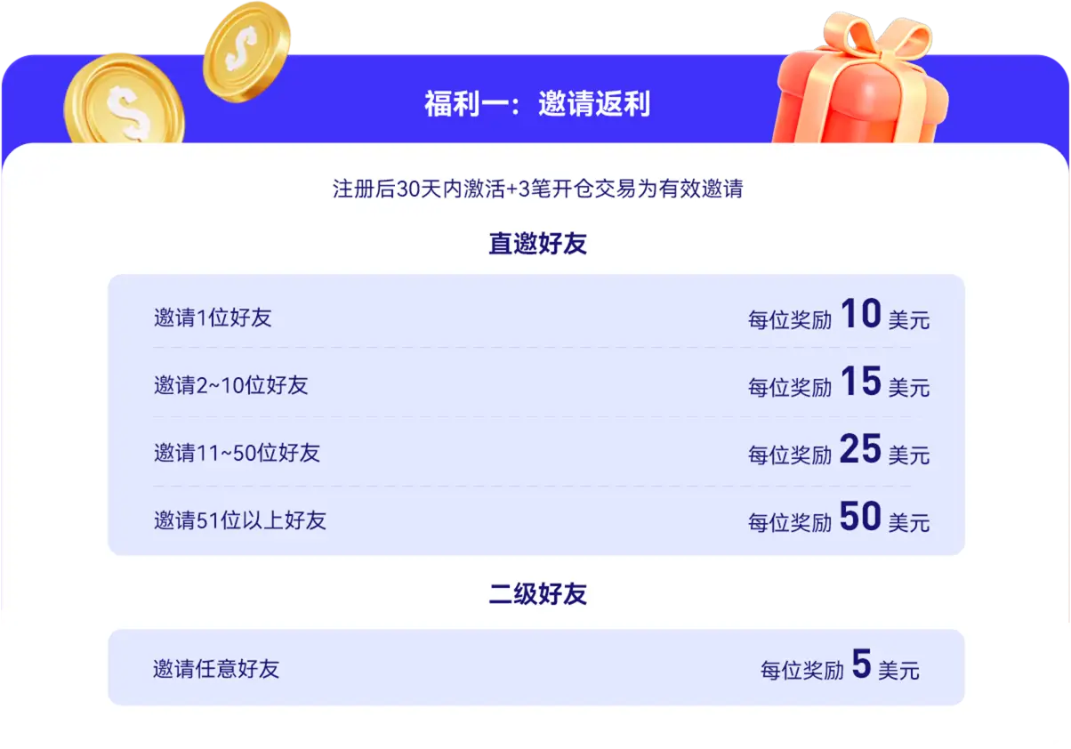(2)邀请奖励需直接邀请好友需在实名后30天内,净存款大于或等于$100+完成3笔开仓(股票/虚拟币除外),方可领取对应奖励。奖励按您直接邀请总人数进行累加,邀请人数越多,您每邀请1人得到的邀请奖励也就越高(您过往邀请激活的好友也将作为有效人数进行邀请人数累计)。