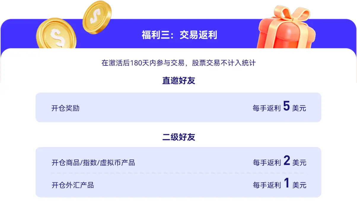 (4)交易奖励统计好友在激活后180天内的累计交易手数(股票除外),直接邀请好友每交易1手,您可以领取对应返利,最高1000美元。二级邀请好友在激活后180天内每完成1手有效交易(股票除外),您也可以领取对应返利,最高1000美元。(不满1手将按照比例发放)